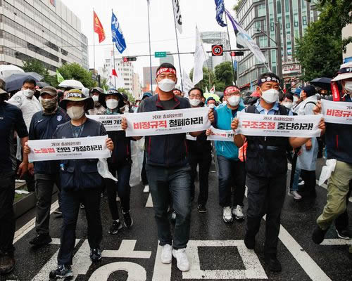 いま韓国には、「勤労基準法」を適用されない5人未満の事業場労働者が358万人、交渉権の制約を受ける間接雇用労働者が346万人、労働基本権を保障されない特殊雇用労働者が220万人いる。全労働者1800万人の約半分920万人余が未組織、非正規職、特殊雇用・プラットフォーム労働者など、労働法の適用を受けられない状況にあるということだ。その上、2001〜19年の間に年平均2300人以上が労働災害で死亡した。昨年11月の全国労働者集会で民主労総が掲げた「チョンテイル3法」制定も、このような現状の中での切実な要求としてあった。