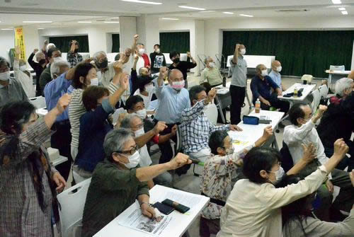 8・20AGC本社行動&デモと、8・11判決を報じた韓国MBCニュースビデオを上映後、支援共闘会議の清水彰二事務局長が基調報告を行った。医療労働者を始めとするコロナ下の闘いを紹介し、「旭支会と韓国サンケン労組と連帯し、闘う労働組合をよみがえらせていくことが私たち支援共闘会議の任務だ。非正規職労働者が自らの解放をかけて立ち上がる中に労働組合と団結を打ち鍛え、新しい世界を建設する力があると、旭支会から学んだ。AGC本社闘争を圧倒的に強化しよう」と訴えた。