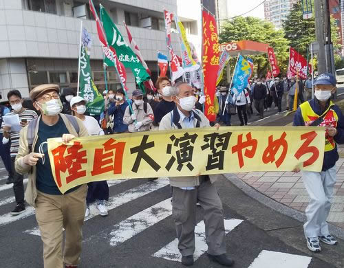 「陸自演習今すぐやめろ」「中国侵略戦争反対」の声を海上自衛隊総監部と在日米軍佐世保基地前に響かせて佐世保市内デモが闘いぬかれた。情勢は中国侵略戦争がいつ火を噴いてもおかしくないほど緊迫している。一握りの支配者の利益のために労働者同士を殺し合わせる侵略戦争を絶対に許してはならない。中国侵略戦争のために設定され、自衛隊の戦争準備に労働者民衆を動員する陸自大演習を何としても中止に追い込む決意を固めて、デモ隊は力強く進んだ(10月23日)