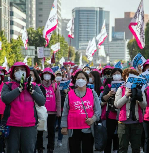 韓国・民主労総(全国民主労働組合総連盟、110万組合員)が不平等打破と平等社会への大転換を訴えた10・20ゼネストは、ムンジェイン政権の集会禁止攻撃を食い破って爆発した。学校で給食や清掃などを担っている非正規職労組を先頭に、1時間ストを闘った公務員労組、建設労組、バイク便労働者など約26万人の組合員がストライキに立ち上がった。全国14地域で開かれた同時多発集会には、ソウル2万4千人をはじめ7万人を超える労働者が集まった。