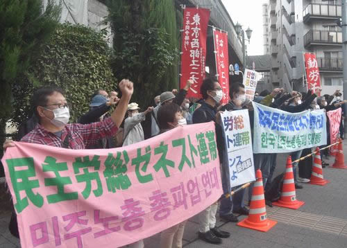 東京では、動労千葉と東京労組交流センターの呼びかけで韓国大使館への抗議・要請行動が闘われた。午後3時30分すぎに約60人が一団となって大使館へ向かったが、警察の不当な介入で動労千葉の関和幸副委員長ら5人のみが大使館前へ。その間、約60人の労働者・学生は近くの二の橋交差点でシュプレヒコール。「今、ソウルでは弾圧を打ち破って大会が開かれている!」の情報を受け、「ムンジェイン政権は民主労総への弾圧をやめろ! ヤンギョンス委員長を解放しろ!」と声を上げた。