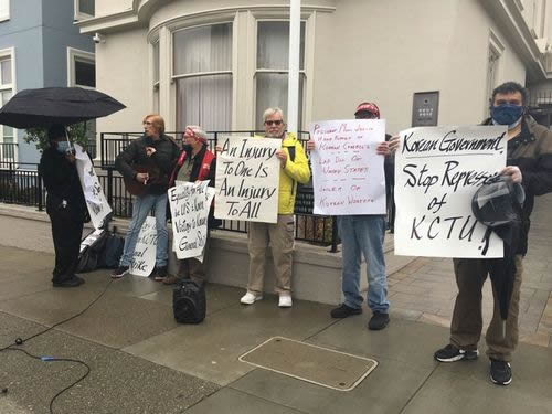 20日正午、アメリカ・サンフランシスコの韓国総領事館前で労働党建設統一戦線委員会(UFCLP) が呼びかけた民主労総連帯集会が開かれた。郵便労働者とUFCLPのスティーブ・ゼルツァーさんらが「郵便民営化攻撃・ウーバーなどの『契約労働』と闘うアメリカ労働者は、民主労総ゼネスト支持で闘う」と訴えた。労働運動研究者は「日帝の朝鮮植民地支配と戦後の米軍占領によってつくられた南北分断体制を今こそ国際連帯で打破しよう」と訴えた。イタリア・ミラノでは、10・11ゼネストを闘ったS・I・Cobas(シ・コバス)が韓国総領事館前で民主労総連帯行動に取り組んだ。