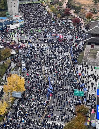 許しがたいことに、9月にヤンギョンス委員長を不当逮捕し、今なお拘束し続けているムンジェイン政権はコロナを口実にまたも集会を禁止。大動員された警察は前日からソウル都心などに車壁を設置し、当日は都心の地下鉄駅で無停車通過を強行するなど、なりふり構わぬ弾圧体制をとった。新型コロナが新自由主義下の社会の矛盾を暴き出し、ムン政権の正体が誰の目にも明らかとなる中、今回の労働者大会は労働者階級自身の力による「社会大改革」の号砲を打ち鳴らす歴史的な場となった。