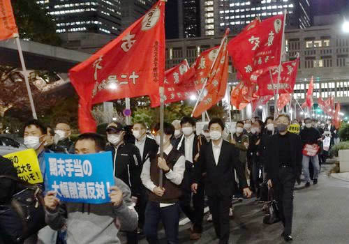 都労連(東京都労働組合連合会、3万6千人)は闘争山場の11月11日夕方、圧倒的高揚感をもって都庁包囲の大デモをかちとった。