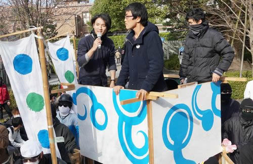 最後は集会場を動き回る巨大なみこしの中から処分された学生たちが登場。職員は無力となり、会場は大きく盛り上がった。無期停学処分を受けている京都大学全学自治会同学会委員長の安田淳敏さんは「京大を国際競争と侵略戦争の牙城とするか、それとも戦争阻止と人類解放の砦(とりで)とするか。この闘いに全国・全世界の学生・労働者が注目しています。『自由の学風』は、学籍も国籍も越えた団結によって勝ち取られるものだ」とアピールを行い、勝利感に満ちて集会は貫徹された。