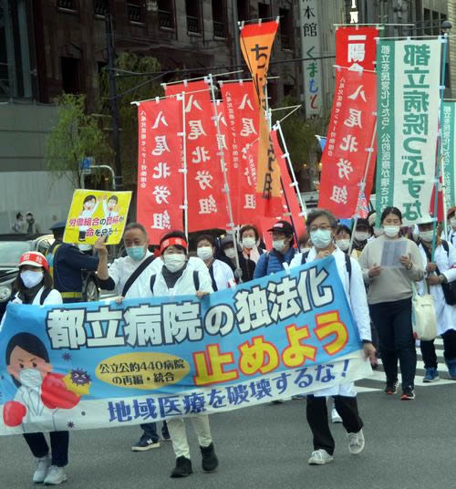 和泉 都立病院の独立行政法人化は医療の民営化です。全部まとめて15病院が独法化されて、いったん全員解雇。これは労働組合を解体する攻撃であり、しかも戦争を想定しています。独立行政法人の定款、これは規約のようなものですが、その中には「緊急事態等に対処するために必要な業務を行う」という言葉が入っています。緊急事態には戦争も含まれる。東京都直轄でもないのに、戦時には知事が戦争労働に従事しろと命じることができるんですよ。こんなの認めるわけにはいかない。