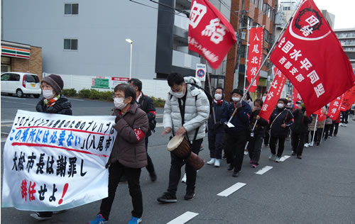 12月22日午後、八尾北医療センター労組・全国水平同盟西郡支部・八尾北命と健康を守る会を中心に30人が大阪・八尾市役所前に結集し、怒りの抗議行動を行いました。