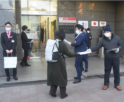 (写真 年賀状配達の「出発式」が行われた日本橋郵便局でも、多くのビラが労働者に手渡された【1月1日 東京・中央区】)