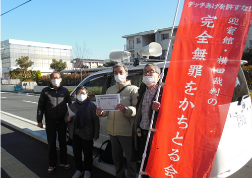 年末には横浜刑務所周辺の住宅地にビラ入れを行っていたこともあって、横浜市港南区役所前でのビラ配りでは、通りかかる2人に1人がビラを受け取るという好反応でした。中には「年末、うちに入っていたビラを読みましたよ。頑張って!」という人、「前にもここでやってましたよね」と覚えていてくれる人もいて、こちらが励まされました。