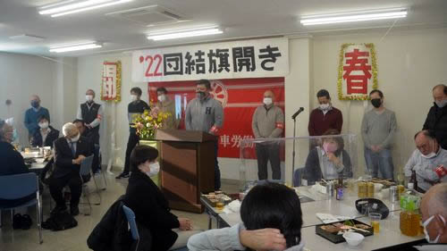 渡辺剛史書記長が「世界で闘う仲間、日本で闘う仲間を奮い立たせるためにも動労千葉が先頭に立つ」と旗開きをまとめた。その堂々とした発言に、参加者は2022年決戦を闘いぬく闘志をさらに強めた。