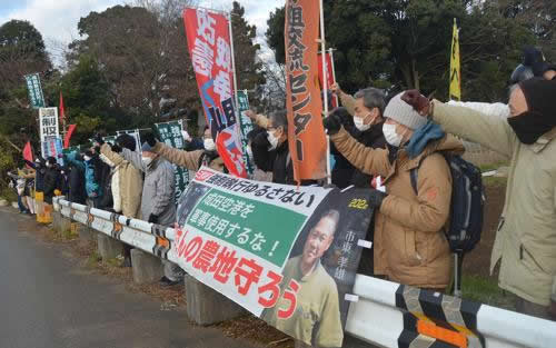 早朝、結集した仲間たちは、市東さんの畑に接する旧小見川県道に立ち、太郎良陽一決戦本部長のリードで決戦突入を宣言した。