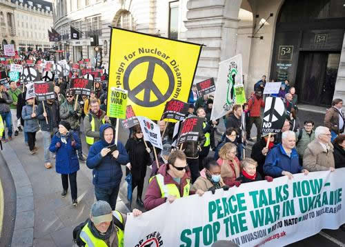STWとCNDは開戦直後からロシアの侵攻に反対するとともに、NATOの東方拡大とウクライナへの軍事支援に反対してきた。しかし、集会参加者に対してメディアは「侵略者プーチンの肩を持つのか!」と総攻撃し、労働党やイギリス労働組合会議(TUC)本部は処分・統制攻撃をかけた。「左派」と言われてきた諸潮流の一部も、NATO批判は「防衛戦争を闘うウクライナ人民への裏切り」であるとして攻撃するなか、反戦闘争の組織化は困難を強いられてきた。