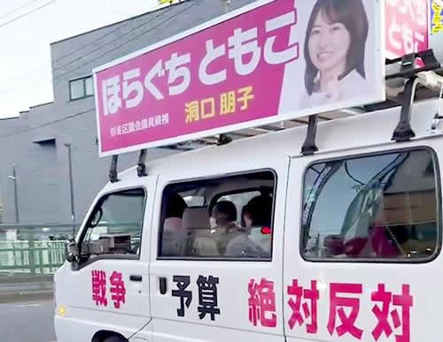 まず、この戦争情勢のなかで、ほらぐち候補が唯一戦争絶対反対を訴えて、2期目に当選した意義は大きいと思います。そして選挙戦をとおして、右翼の妨害もはねのけて、みんなの力で杉並からこれまでで最大の選挙運動ととともに、反戦運動をくりひろげたと思います。街頭宣伝は、みな一人ひとりがほらぐち候補となって、自衛官募集業務のことなどを訴えた結果、足を止めて話を聞いたり、署名してくれた人が多くいました。地区の労働者が一人でもやると言った街宣の中では、古参の同志がマイクも使わず、大きな声で反戦を訴えた結果、中学生と大学生の若者が署名に協力してくれました!