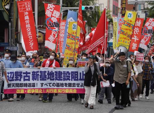 (写真 沖縄本土「復帰」51年目の沖縄闘争で那覇市の国際通りをデモ。右翼の妨害を蹴散らし、「南西諸島を戦場にするな」「辺野古新基地建設阻止」「G7広島サミット粉砕」と訴えた【5月13日】)