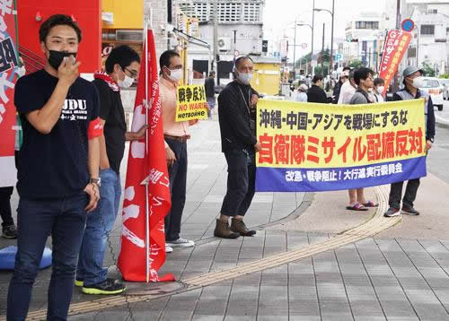 集会に先立ち、1970年のコザ暴動の発祥地となった胡屋(ごや)十字路で街頭宣伝を行いました。コールセンター労組と共に全国の青年労働者・学生が旗を上げ訴えたことに、まばらな人通りにもかかわらず次々と支持の声が集まり、100枚以上のビラが受け取られ、20筆を超える反戦署名が寄せられました。(動労総連合青年部・片峯潤一)