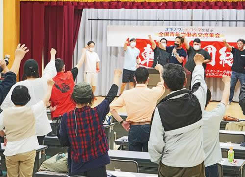 5月14日、「オキナワとヒロシマを結ぶ全国青年労働者交流集会」が沖縄市で開催されました。大阪市職労の赤田由行さんが基調報告を行い、3度目の世界戦争の危機が迫る中で沖縄を再び戦場にする攻撃を弾劾し、「労働組合が戦争協力拒否の闘いを巻き起こす時だ」と提起しました。また、沖縄コールセンター労働組合のストライキが階級的労働運動再生の展望を切り開いていることを明らかにし、闘いへの支援とG7サミット粉砕闘争への決起を訴えました。