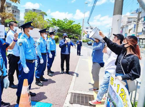 沖縄大学学生自治会は5月12日、沖大処分撤回・阻止集会をキャンパス中央で開催した。集会弾圧に来た職員と職員が呼び寄せた機動隊と対峙(たいじ)し、沖大生との合流をかちとって集会は大成功した。