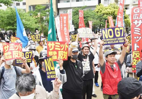 5月19日午後1時、午前中のG7首脳平和公園訪問弾劾デモに続いて袋町公園に約600人が結集。改憲・戦争阻止!大行進実行委員会と8・6ヒロシマ大行動実行委員会の共催で全国総決起集会が開催された。冒頭、サミットへのオンライン参加を予定していたウクライナのゼレンスキー大統領が急きょ来日し対面で参加することが報告され、集会参加者は改めて戦争会議への怒りをたぎらせた。