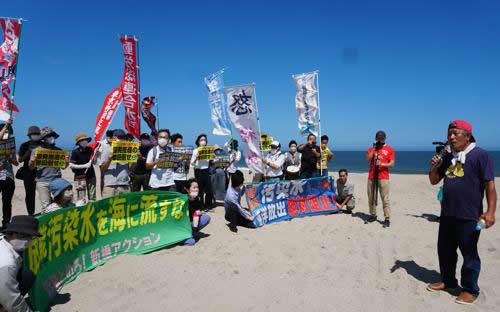 集会後、午後1時の放出時刻に合わせて浪江町請戸海岸に移動し、弾劾行動に入った。目前に海洋放出が狙われる福島第一原発の排気筒が見える。全員で渾身(こんしん)の怒りを込めて「徹底弾劾」のシュプレヒコールを行う。強風に「怒 福島」の旗も翻る。NAZEN関西、東北大、京都大の学生、そして吉沢さんが海洋放出弾劾の怒りの発言を行った。参加者は、目の前の海に原発汚染水が放出されていることに改めて怒りをたぎらせた。