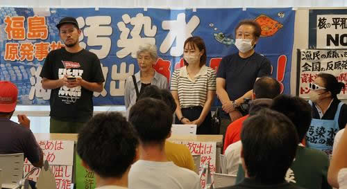 集会冒頭、3・11実行委が、午後1時に強行される原発汚染水の海洋放出攻撃を絶対に許さない闘いを、全員の力でかちとろうと訴えた。続いて同実行委共同代表の鈴木光一郎さんのメッセージを紹介した。「漁民の絶対反対に連帯しなければならない。福島は決して負けません」と強い決意が寄せられた。