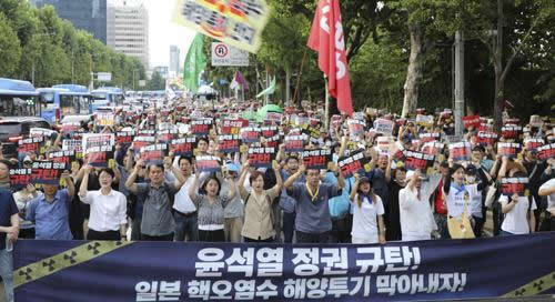 26日にはソウルで、日本の核汚染水投棄を容認したユンソンニョル政権を糾弾する5万人の大集会とデモが闘われた。民主労総と福島汚染水海洋投棄阻止共同行動、野党4党が共同で主催。参加者はユンソンニョルを「核汚染水によるテロの共犯者」「日本政府の手先」と激しく断罪した。