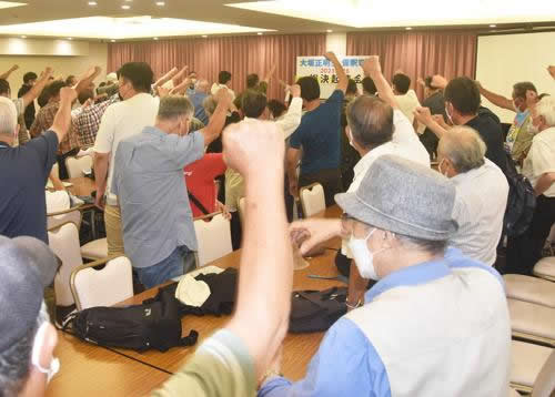 冒頭、大坂さんのメッセージ(別掲)が朗読された。続いて大坂さんの親族の佐藤政直(まさのぶ)さんが作った動画「沖縄と闘争」を上映、沖縄返還協定批准の不当性と、「殺人罪」でっち上げの権力犯罪を突く、説得力ある動画だ。佐藤さんは続いてあいさつに立ち、「これまでの裁判でやっていない証拠しか出ていないのに親族として黙っているわけにはいかない」と、無罪判決まで共に闘う決意を述べ、全参加者が感動の拍手で応えた。