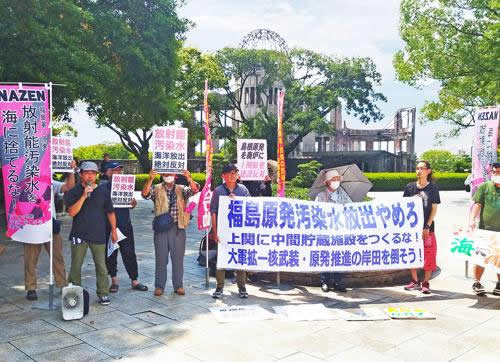 広島で8月23日と24日、岸田政権の福島原発汚染水放出の決定を徹底弾劾する行動を行った。被爆者を先頭に広大生や8・6ヒロシマ大行動とNAZENヒロシマが取り組んだ。23日は本通で街宣を行い、汚染水放出反対署名が1時間で27筆集まった。核武装・原発推進のための中国電力による山口県上関町への中間貯蔵施設建設反対の署名も集めた。24日は汚染水放出予定時刻の午後1時に向けて、正午から原爆ドーム前で抗議のスタンディングとリレートークを行った(写真)。多くの通行人や観光客から圧倒的な注目を浴び、最後に「福島汚染水放出絶対反対! 岸田を倒せ!」のシュプレヒコールをあげた。