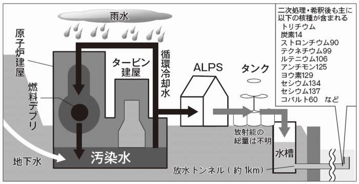 通常の原発では、運転に伴い発生したトリチウムを含む放射性物質のほとんどは原子炉圧力容器内の燃料棒の中に閉じ込められる。トリチウムが発生するのは核分裂制御材のホウ素や冷却水に含まれる重水に中性子が当たるなどするためだ。海に流す温排水は核燃料には直接触れず、トリチウム以外に含まれるのは少量のコバルト60などだ。