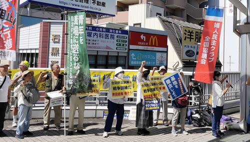 9月1日、9都県市合同防災訓練中央会場の相模原市の訓練には岸田首相も参加。最寄りのJR相模原駅前で改憲・戦争阻止!大行進神奈川と婦人民主クラブ全国協議会の呼びかけで「〝防災〟に名を借りた戦争訓練だ!岸田政権を倒そう!」と街頭宣伝