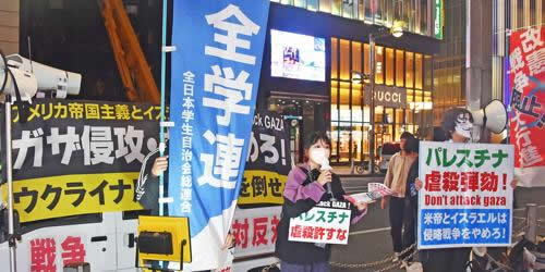 10月28日、改憲・戦争阻止!大行進東京は、20、26日に続きイスラエル大使館に連続抗議行動に決起した。警視庁・機動隊が大使館に通じる公道を封鎖し妨害したが、全学連を先頭に「イスラエルはガザ空爆・侵攻をやめろ」「日本政府・警察は大虐殺に加担するのか」と徹底弾劾した(千代田区)