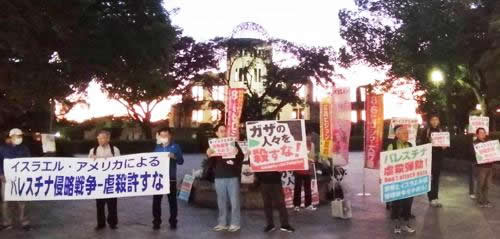 31日、8・6ヒロシマ大行動実行委員会が平和公園の原爆ドーム前で地上侵攻弾劾の緊急抗議行動