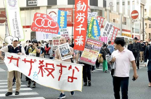 千葉市街では3日、大行進千葉の主催で70人が、千葉では初のパレスチナ連帯デモを打ちぬいた。