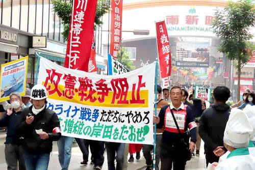 4日の板橋反戦集会&デモには90人が結集した。自治体の自衛官募集業務や、学校・都営地下鉄を使った弾道ミサイル避難訓練などの戦争動員攻撃に対し、自治体、教育、都営交通の労働者が断固反対を表明。板橋区役所―商店街を通るデモを、住民が手を振り迎えた。現場労働者と地域住民が結びつけば戦争は止められると確信を深めた。