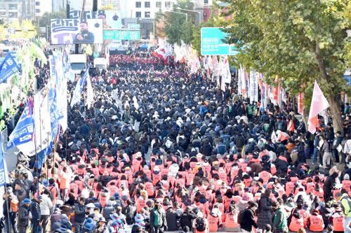 (写真 西大門交差点に設置された舞台を起点として、韓国全土から集まった約5万人の労働者が車道を埋め尽くした。動労千葉訪韓団も合流した【11月11日 ソウル市】)