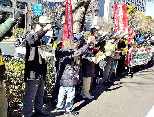 要請行動では、久原正子水平同盟委員長を先頭に水平同盟の五つの支部、動労千葉、動労総連合水戸、東京各地区労組交流センターなど12団体が怒りの要請文をたたきつけた。全参加者がひとつとなって、「家令裁判長は『下山鑑定』の鑑定人尋問を行え」「裁判所は自らインクの鑑定を行え」と激しく迫った。そして、3月一審死刑判決60年、10月寺尾確定判決50年を徹底弾劾し、イスラエルを支援する岸田政権の戦争政治を許さないと、声を大にして訴えた。