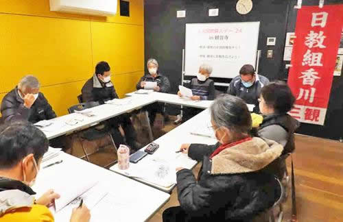 昨年12月のストライキで始めた24反戦春闘は、1月の星野絵画展、高松港軍港化反対デモ、ミサイル避難訓練反対の闘い、2月の軍港化を許さない県庁前行動とウクライナ反戦デモ、イージス艦の入港反対緊急行動と、闘い続けてきた。