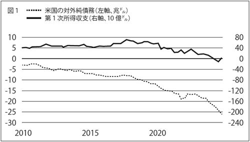 米国の対外純債務も、直近は約26兆㌦(約3900兆円)にまで増加した(図1)。対外債権から受ける利息や配当から対外債務に対して支払う利息や配当を差し引いた第1次所得収支は、赤字寸前にまで悪化した。さらに、ウクライナ支援や海外への無償贈与の勘定である第2次所得収支を合計すると、21年から傾向的に赤字になった。国外との関係で利息が利息を生む借金地獄が始まった。これがドル信認を崩す最大要因と化すのは必至だ。