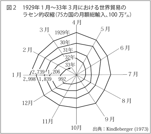 こうした世界貿易の分断とブロック化は、必ず世界経済を収縮させていき、大恐慌に転じる可能性を高める。1930年代には、世界75カ国の総輸入額は29年の29億9800万㌦から33年1月の9億9200万㌦に縮小(図2)。それが29年からの大恐慌をより深く、より長いものにした。