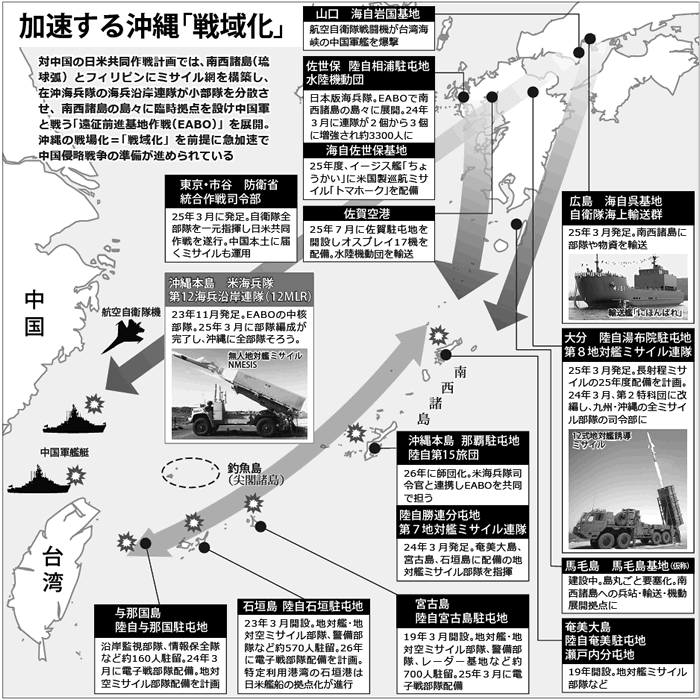 米海兵隊の対中国作戦「遠征前進基地作戦(EABO)」は、南西諸島の島々に移動を繰り返しながら臨時基地を建設し、中国軍とミサイルを撃ち合う想定の作戦であり、沖縄を戦場とすることを前提にしているものだ。EABOには陸上自衛隊水陸機動団をはじめ自衛隊が全面的に参戦・協力して中国軍を打ち破り、中国本土に侵攻することが計画されている。