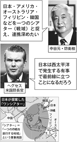 3月30日の日米防衛相会談で、中谷が対中国を念頭に「日本は『ワンシアター』の考え方を持っている。日・米・オーストラリア・フィリピン・韓国などを一つのシアターと捉え、連携を深めていきたい」とヘグセス米国防長官に提案したことがわかった。