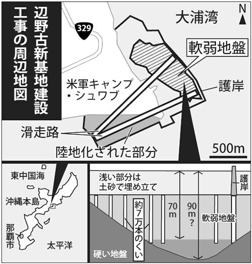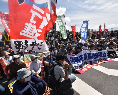 沖縄県民の圧倒的多数が幾度も反対の意志を示したにもかかわらず、沖縄防衛局は17年2月、キャンプ・シュワブ沿岸での埋め立て工事を開始、同年4月には護岸工事にも着工し、18年12月には辺野古沿岸への土砂投入を開始した。だがこの間に、埋め立て予定海域北側の大浦湾に「マヨネーズ状」と言われる軟弱地盤が発見された。地盤改良には最深90㍍もの海底に計7万1千本の杭を打ち込む前代未聞の工事を要するが、防衛省はあくまでこれを強行するとして、昨年1月に大浦湾側での工事を開始、今年1月には杭打ち作業に踏み切った。もはや基地建設計画そのものは完全に破綻しているにもかかわらず、ただ沖縄の反戦反基地の「戦意をくじく」ためだけに、日本政府・防衛省は工事を強行しているのである。