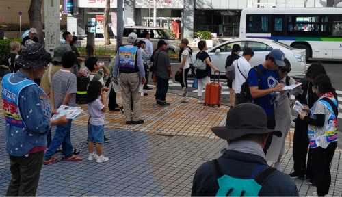 (写真 大坂さんを取り戻そう! 「今こそ安保・沖縄闘争を闘い、無実の大坂正明さんを取り戻そう」。大坂正明さん奪還の訴えが沖縄県庁前交差点に響いた。大坂救援会が呼びかけた40人を超える大街宣は、大きな注目を集め、多くの署名が集まった【5月18日 那覇市】)