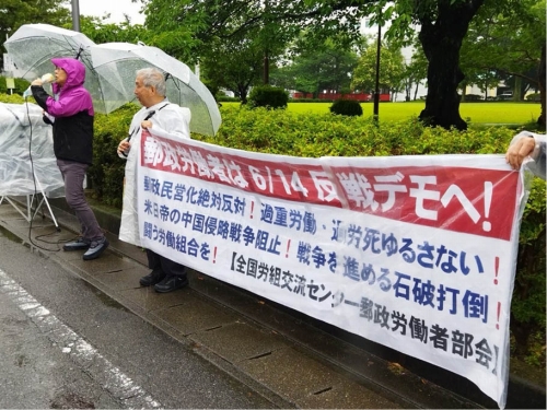 全国労組交流センター郵政労働者部会と改憲・戦争阻止!大行進ぐんまは6月11日、高崎市で開催されたJP労組第18回定期全国大会の会場前で、代議員に「郵政労働者は6・14反戦デモに立とう」と訴える大宣伝活動を闘いました。