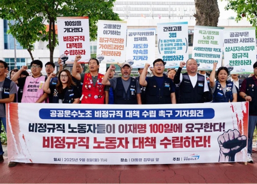 (写真 「大統領就任100日、非正規職差別解消に取り組め」。公共運輸労組の非正規職労働者が大統領室前で記者会見【9月8日 ソウル】)