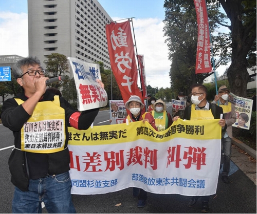 部落解放東日本共闘会議と全国水平同盟の呼びかけで10月27日、東京高裁包囲糾弾闘争をうちぬいた。各地から日比谷公園に集まった仲間は、解放共闘・徳永健生事務局長の「寺尾判決51カ年糾弾、第4次再審闘争に勝利しよう」「本日来日するトランプ、高市を打倒しよう」との訴えを受けてデモに出発。トランプ来日に伴う厳戒態勢を打ち破り、差別糾弾・戦争反対のコールを霞が関一帯にとどろかせた。デモ終了後には直ちに東京高裁前でのビラまき・宣伝活動を行って家令和典裁判長を弾劾するとともに、労働者市民に共に狭山闘争に立ち上がるよう訴えた。