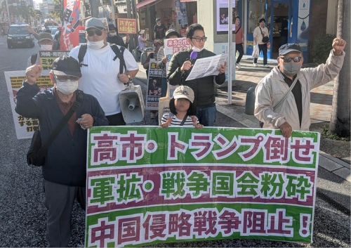 沖縄でも11月28、29日に中国侵略戦争阻止、安保粉砕・全基地撤去、高市・トランプ打倒の反戦スタンディングとデモを闘い抜きました。高市の「存立危機事態」発言などすさまじい排外主義が扇動される中、改憲・戦争阻止!大行進沖縄はほぼ毎週、夕方に那覇の県庁前で街宣を行い、闘いを組織してきました。今回の行動は、防衛相・小泉の先島諸島「視察」や、辺野古・大浦湾埋め立て開始に対する人々の怒りと固く結びつくものとなりました。