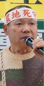 そして、市東孝雄さんが「農地死守」のはちまきを締めて登壇した。父・東市さんの営農と闘魂を受け継いで27年が経過したことを感慨深く語り、「60年もかけて、国家暴力を使っても闘争をつぶせなかった。〈闘魂ますます盛んなり〉の言葉を大事に、福島・沖縄・三里塚を一つの闘いとしてがんばります」と、鮮明な決意を表明(発言別掲)。誠実な発言は参加者の胸を打ち、全員が大きな拍手で応えた。
