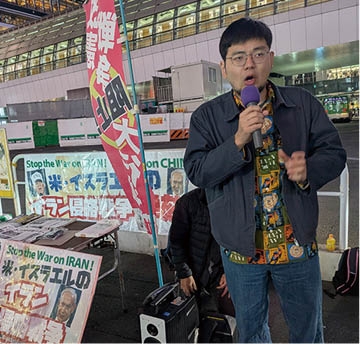 全学連の渡辺祥英書記次長がマイクを握り、極悪極まるイラン侵略戦争を徹底弾劾し、女子小学校をはじめイラン全土への攻撃ですでに数千人を殺害するという、ガザ大虐殺と一体の人民大虐殺に満身の怒りをたたきつけた。「何よりもイラン侵略戦争は中国侵略戦争―世界戦争の始まりであり、帝国主義とスターリン主義を打倒し世界戦争を阻止しよう」と呼びかけた。労組交流センターの女性労働者、青年労働者も怒りのアピールを行った。