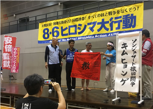 8・6広島で熱く日韓連帯 週刊『三里塚』02頁(0973号01面02)(2017/08/14) 8・6広島で熱く日韓連帯 8・6ヒロシマ大行動に参加した反対同盟婦人行動隊の宮本麻子さんが、サード撤回ソンジュ闘争委員会のキムヒョンゲさんに檄布を手渡し連帯を深めた。 Tweet 前の記事 次の記事