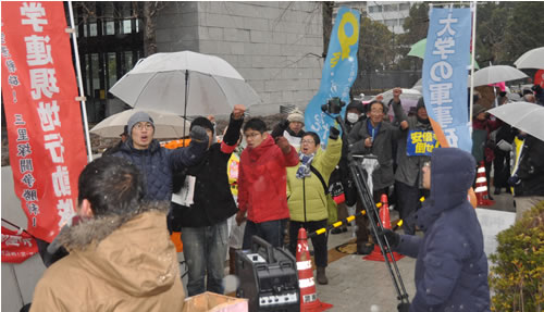 全学連が国会前抗議行動に立つ 週刊『三里塚』02頁(0984号01面03)(2018/01/22) 全学連が国会前抗議行動に立つ 1月22日、全学連の主催で〝安倍政権による改憲と「働き方改革」粉砕〟の国会前行動が闘われた。雪混じりの寒空の下、労働者・学生100人が集まり、朝鮮戦争阻止・安倍政権打倒を訴えた。 Tweet 前の記事 次の記事